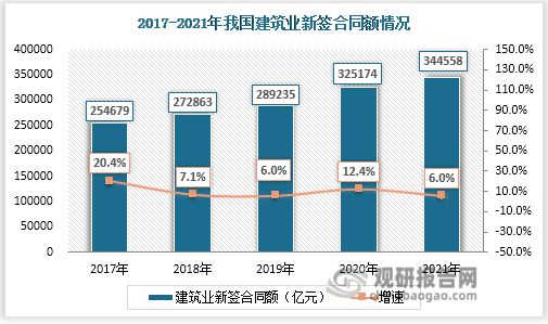 建筑行业是我国紧固件产品主要消费领域之一,近年来随着经济向好发展,人民生活不断改善,国家积极财政政策的实施,我国建筑产业建造技术与西方发达国家差距持续缩小;且国内建造能力逐渐加强,规模进一步扩大,产业向工业化、数字化、智能化方向转化。2017-2021年我国建筑业新签合同金额逐年稳步递增,从254679亿元提升至344558亿元,2021年同比增长6.0%。